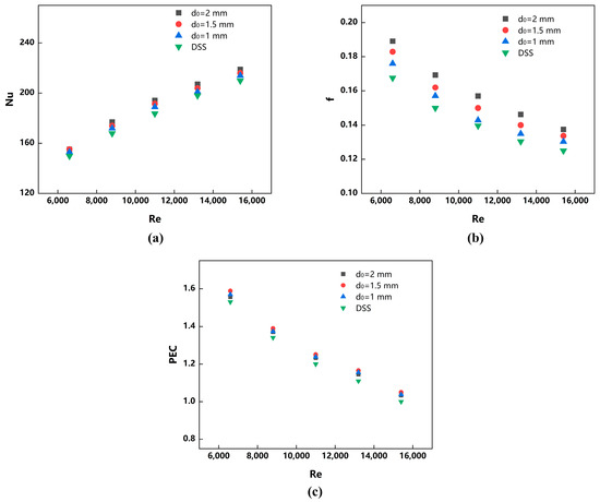 As depicted in Figure 12, the Nusselt numbers of both the DSI tubes and the DSS tubes increase with the Reynolds number for a given key length. Concurrently, the friction factor decreases as the PEC gradually declines. It can also be observed that a longer key length corresponds to higher Nusselt numbers and friction factors. Within the examined range of Reynolds numbers, the DSI tubes demonstrated a 3% to 7% enhancement in Nusselt number and a 5% to 12% increase in friction factor when compared to the DSS tubes. Notably, the tubes with d0 = 2 mm displayed the highest Nusselt number and friction factor values. Furthermore, the PEC values were improved by 1.74%–5.14%, with the tubes featuring the largest PEC being those with d0 = 1.5 mm.