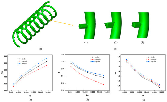 This study selected three distinct key shapes: circular, equilateral triangular, and square, as shown in Figure 13b from 1 to 3,while maintaining consistent parameters (pitch P = 10 mm, wire diameter e = 2 mm, and identical cross-sectional areas) for numerical simulation. Figure 13a,b illustrate these simulations, while Figure 13c–e demonstrate the relationships between Nu, f, PEC, and the Reynolds number.