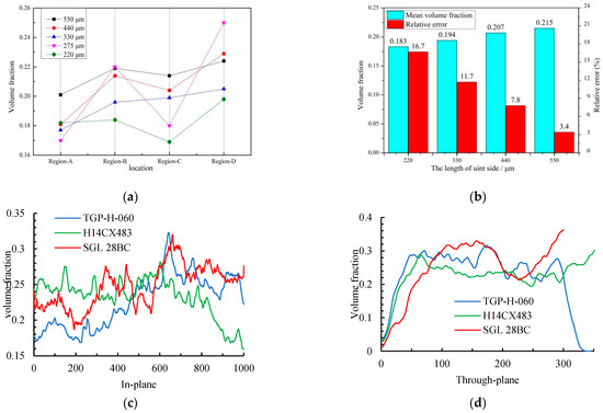 The volume fraction of GDL: (a) different sized units in different areas; (b) mean volume fraction and relative error; (c) in-plane; and (d) through-plane.