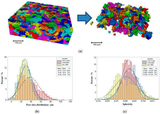 The pore morphology significantly influences the two-phase flow within the pore. The description of pore morphology was challenging when compared to the equivalent diameter of the pore. According to the description of particle morphology parameters, we employed dimensionless shape factors to characterize the pore morphology and subsequently determined the pore sphericity, aspect ratio, and specific surface area. Sphericity, defined as the ratio of the spherical surface area to the pore surface area for a given volume, decreases as the deviation of pore shape from a perfect sphere increases. The pore characteristics of the GDL are depicted in Figure 7b,c. The distribution of the equivalent diameter and sphericity for the GDL follows a normal distribution. The equivalent diameters were concentrated in the range of 12.5 μm to 87.5 μm, with SGL28BC exhibiting the smallest average pore size of 27.4 μm and H14CX483 displaying the largest average pore size of 37.6 μm. The TGP-H-060 exhibited an average pore diameter of 29.70 μm with a standard deviation of 12.37, which is consistent with the findings reported in the literature [22,24]. The average sphericity values were 0.5588, 0.5447, and 0.5108, respectively, indicating a deviation of the pores from a spherical shape. The average value of the other pore structure parameters are shown in Table 1. The average flatness and specific surface area of the pores were approximate 0.5 and 0.5 μm−1, respectively, while the average aspect ratio approached 1.5. These findings indicate that the pore morphology within the GDL is predominantly characterized by a distribution of flat and irregular shapes.