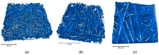 3D-μXCT is a high-resolution imaging technique that utilizes the penetration of X-rays to obtain the morphology of a sample without damaging it. The device and principle of 3D-μXCT are shown in Figure 2, which consists of X-ray source, sample table, and detector [10]. The sample table is rotated to obtain a series of CT cross-section images. Substances are distinguished based on the varying attenuation of the rays’ intensity as they penetrate different materials, attributed to the low density of carbon fibers. The smaller pixel values correspond to the pores, which manifest as regions of lower intensity, whereas the bulk phase exhibits higher density and appears as a brighter region in the image. The image reconstruction algorithm is utilized to determine an optimal threshold value, which in turn enables the segmentation of the sample microstructure. Detailed principles and image processing methods of 3D-μXCT are described in Refs. [10,12,20].