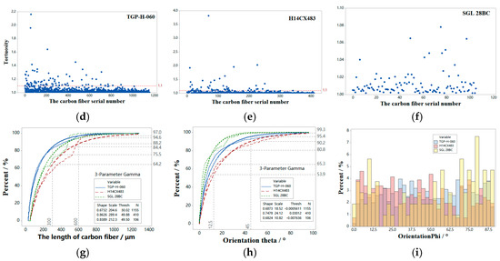 Tortuosity, defined as the ratio between the fiber length and fiber chord length, serves as an indicator of bending degree. As depicted in Figure 8d–f, the distribution of fiber tortuosity was primarily concentrated within the range of 1.0 to 1.1, with average values recorded at 1.032, 1.056, and 1.012, respectively. Among them, the tortuosity of SGL28BC was less than 1.1, exhibiting exceptional linearity. H14CX483 demonstrated the highest tortuosity, with a maximum value of 3.81, primarily attributed to its specific manufacturing process, as depicted in Figure 5d.