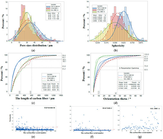 GDL structure parameters: (a) pore sizes distribution; (b) sphericity; (c) length of carbon fiber; (d) orientation theta. Tortuosity: (e) TGP-H-060-M, (f) H14CX483-J, and (g) SGL28BC-A.
