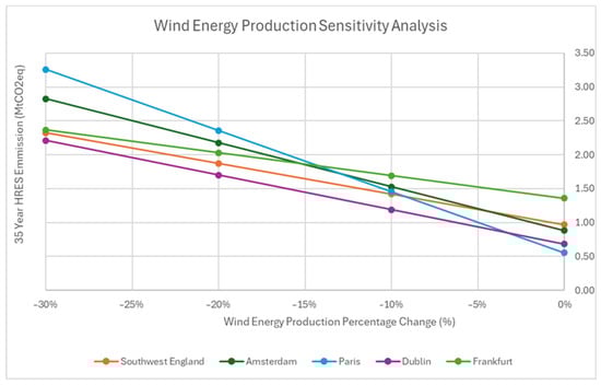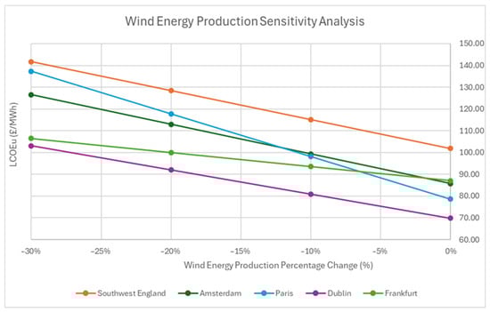 Table 7 shows the generation and capacity factor for both solar and wind at each site. It is recognised that the capacity factors shown in Table 7 for wind generation at the Amsterdam, Paris and Dublin sites are high in comparison to current onshore values for Europe, which for new wind farms are expected to be between 30 and 35% [34]. This variation could be explained by the hub height, selected in WindPRO, exceeding 150 m, which is achievable though not yet common. A sensitivity analysis is included below in Section 3.5 which demonstrates that this potential over-estimation in wind generation does not affect the overall suitability of the proposed systems.
