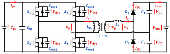 Figure 1 illustrates the PSFB-SRC studied in this paper. The PV panel voltage and current are denoted as and , respectively. An input capacitor is used to filter out high-frequency ripples. Four MOSFETs (, , , ) form a full-bridge circuit, with their parasitic capacitances represented by , , , and . The drain-to-source voltages of the MOSFETs are denoted as , , , and .