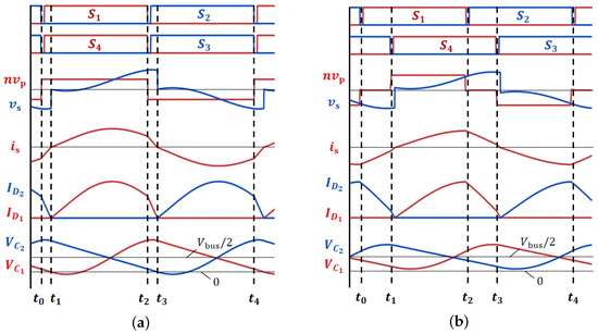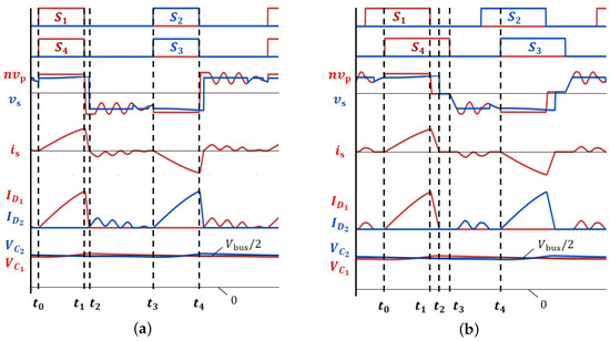 Figure 2a,b present typical waveforms of the converter operating in SRC mode and PSFB mode, respectively. In SRC mode, the gate signals of and are identical, whereas in PSFB mode, there is a phase shift between the leading bridge leg (constructed with and ) and the lagging bridge leg (constructed with and ).