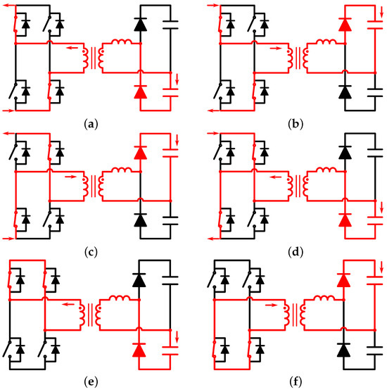 Equivalent circuits: (a) SRC Mode ; (b) SRC & PSFB Mode ; (c) SRC Mode ; (d) SRC& PSFB Mode ; (e) PSFB Mode ; (f) PSFB Mode .