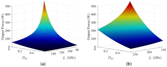 Figure 4a,b depict the converter’s output power as a function of variations in the phase shift angle and switching frequency for input voltages of 30 V and 50 V, respectively, based on Equation (7). At an input voltage of 30 V, the converter successfully transfers power across almost the entire load range through the combined use of frequency and phase shift control. However, when the input voltage rises to 50 V, the preset ranges for switching frequency and phase shift angle become inadequate to support light load operation (below 100 W). This highlights the limitations of the current control strategy under higher input voltage conditions.