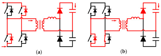 From to in Figure 5a: The equivalent circuit is depicted in Figure 6a. During this interval, no MOSFETs are actively switched on; instead, the anti-parallel diodes of and are activated, resulting in .