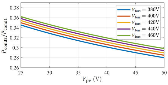 Figure 8 depicts how the conduction loss ratio varies with changes in the PV voltage and bus voltage . In all operating conditions, the conduction losses in the mode with phase shift are notably lower than those in the no phase shift mode. This performance advantage becomes more significant as the PV voltage rises or the bus voltage decreases.