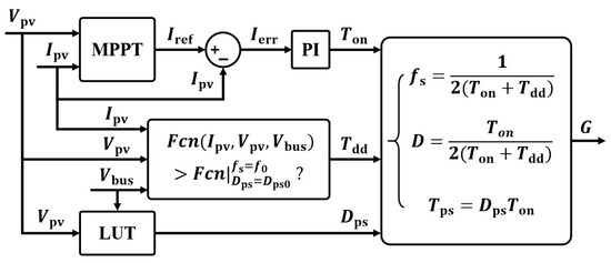 Equations (19) and (20) are used to determine the operation mode, as presented in Figure 9, where a question mark is employed to represent a crucial judgment logic. If the inequality holds, the PSFBSRC operates in heavy load mode. In this scenario, is minimized to prevent direct conduction between MOSFETs in the same bridge leg, thus ensuring safe operation. Otherwise, if the inequality does not hold, the PSFBSRC operates in the light load mode, where the output gain is described by Equation (13) and a larger is applied as a feed-forward variable to reduce the switching frequency and switching loss, as the MOSFETs are in hard switching. In both light and heavy load modes, is calculated using a simple PI controller, while is obtained from a lookup table based on the PV voltage. Finally, the switching frequency, duty cycle, and phase shift time are determined from , , and , and these parameters are applied in digital controllers to optimize the performance.