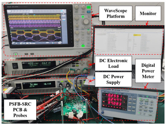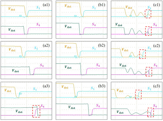 Zero voltage switching (ZVS) is closely linked to overall power efficiency. The performance under various input voltage and output power conditions is presented in Figure 12, with the specific operating conditions detailed in Table 2. ZVS was achieved in most scenarios, except for certain critical cases: In Figure 12(a3), the MOSFET in the lagging bridge leg experienced hard switching, as highlighted by the red dashed block. This condition arose due to a large phase shift angle. Reducing this angle and correspondingly increasing the switching frequency could significantly improve the efficiency. In Figure 12(c1,c2,c3), both MOSFETs in the bridge legs underwent hard switching, also indicated by the red dashed blocks. These conditions occurred when the PSFB-SRC operated in light load mode. Under the latter conditions, the increased efficiency compared to normal operation mode was primarily attributed to the reduced switching frequency, which minimized the switching losses.