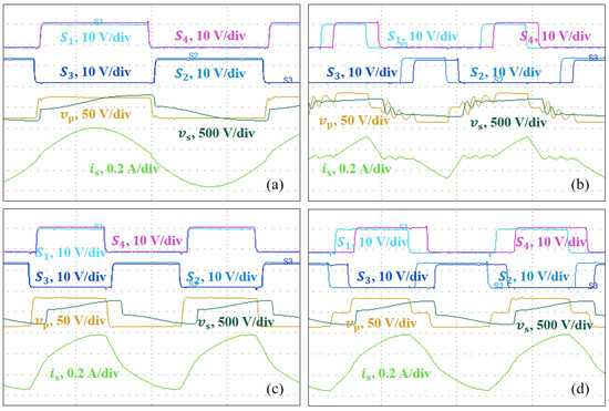 Experimental waveforms under different operating conditions: (a) = 25 V, = 15 A, = 0; (b) = 35 V, = 2 A, = 0.3; (c) = 35 V, = 10 A, = 0; (d) = 35 V, = 10 A, = 0.3.