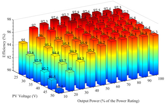 Efficiency across the full output power range at various PV voltages.