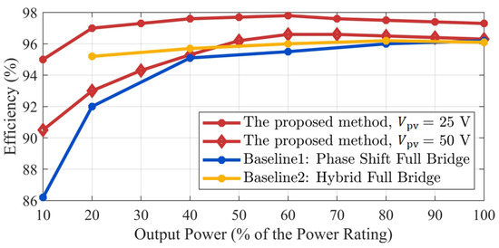 Figure 14 shows the experimental efficiency results across the full load range for the proposed method, compared with Baseline1 from [10] and Baseline2 from [15]. At an input voltage of 25 V, the proposed solution exhibited a higher efficiency throughout the entire load range than both baselines. When the input voltage was 50 V, while the proposed approach was slightly less efficient than baseline2 under light loads (below 50% of rated power), it outperformed both baselines in the heavy-load range (50–100% of rated power). Notably, the proposed system’s peak efficiency exceeded that of the baselines in [10,15], highlighting its superior performance.