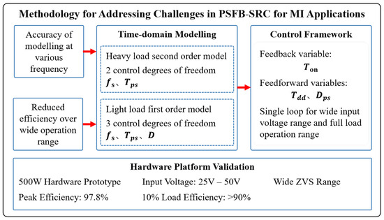 A flowchart of the methodology for addressing challenges in PSFB-SRC for MI applications is presented in Figure 15. In conclusion, this study addressed the modeling and efficiency challenges associated with PSFB-SRCs in MI applications, especially under conditions of a light load and high input voltage. By developing first- and second-order time-domain equivalent models, the limitations of traditional FHA, which is typically constrained to near-resonant frequencies and therefore not suitable for wide-range operation, were overcome. The equivalent models accurately predicted the converter’s performance across a broad spectrum of operating conditions, leading to precise determination of the output gain.