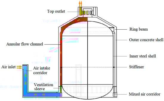 The ACP100 features an outer concrete shell and an inner steel shell. The space between the above two shells forms the PAS flow channel. Under accident conditions, passive cooling is achieved by the density difference between cold and hot air, ensuring that the temperature and pressure inside the inner steel shell remain within design limits [10]. Figure 1 presents a schematic representation of the PAS flow channel structure, which primarily consists of four air inlets, a top outlet, and an annular flow channel situated between the inner and outer shells.