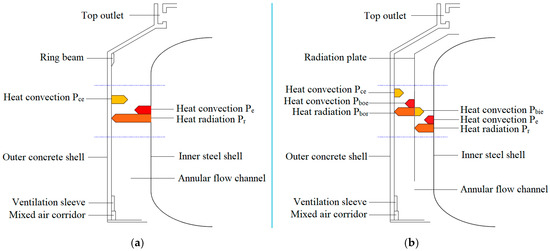 The shape and appearance of the radiation plate closely resemble those of the inner wall of the outer concrete shell. Furthermore, most areas of the radiation plate are either parallel or nearly parallel to the outer wall of the inner steel shell. In comparison to the size of the radiation plate, the separation distance can be considered negligible. The radiative heat transfer between the radiation plate and both the inner wall of the outer concrete shell and the outer wall of the inner steel shell can be approximated as typical radiative heat transfer between infinitely large parallel plates [21]. Consequently, the following relationship holds: