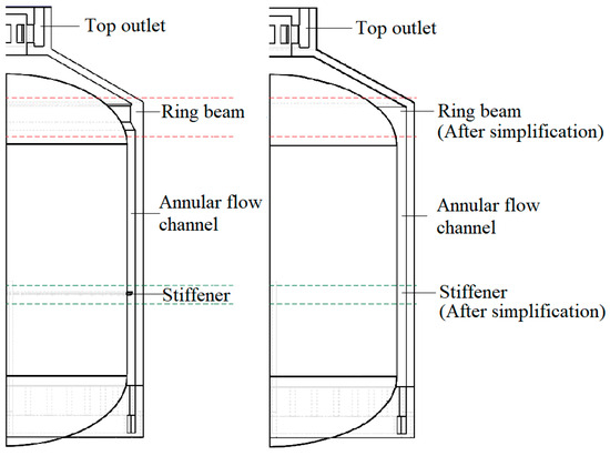 The simplified original field model of the PAS simplifies the structural design of both the stiffener and the ring beam. Under severe accident conditions, the outer wall of the inner steel shell heats the air within the PAS flow channel, either directly or indirectly, through mechanisms of heat radiation and convection [18,19,20].