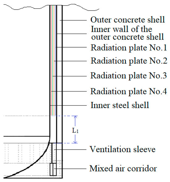 The distance from the bottom of the radiation plate to the outlet of the ventilation sleeve is denoted as L1, while the diameter of the ventilation sleeve outlet, referred to as L2, measures 0.7 m. To mitigate the influence of the radiation plate on airflow at the outlet of the ventilation sleeve, it is essential to ensure that L1 ≥ 7L2 [11,12].