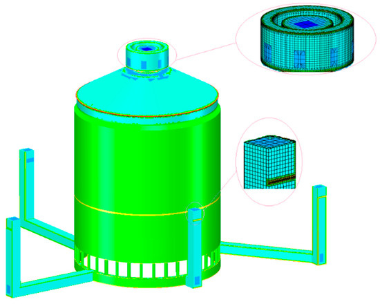 The assessment of the impact of the radiation plate on the heat transfer performance of the PAS adheres to a conservative approach. The annual average environmental temperature in Changjiang, Hainan, ranges from 23 °C to 29 °C, with historical peaks reaching up to 41.5 °C over recent decades. Taking into account the heat island effect surrounding the nuclear power plant, an environmental air temperature of 45 °C was assumed for calculations. In reference to accident scenarios involving failures in either two or four channels of the pressurizer surge line [13,14], the surface temperature of the inner steel shell was established at 130 °C. The analysis disregarded external wind field influences [11,12] and air humidity, employing a combination of structured and adaptive grids for grid division.