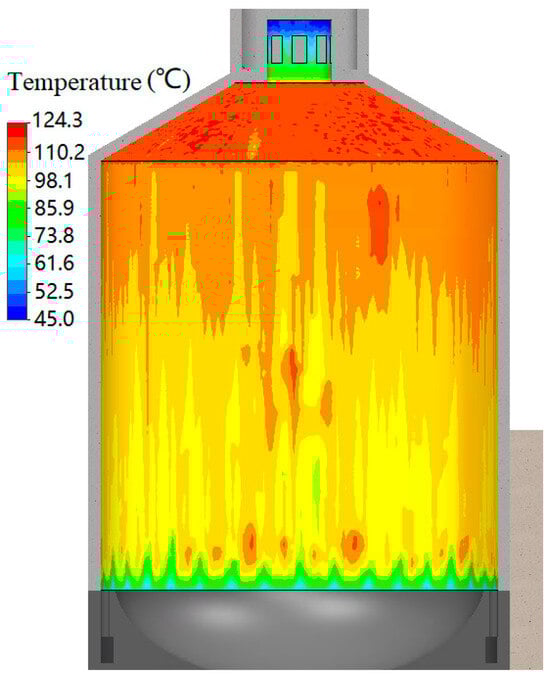 The outer wall of the inner steel shell transfers heat to the inner wall of the outer concrete shell through radiation, resulting in an increase in temperature on the inner wall of the outer concrete shell. Figure 8 illustrates the temperature distribution on the inner wall surface of the outer concrete shell. The maximum surface temperature reaches 124.3 °C, with an average temperature recorded at 104.2 °C. Given that the PAS cooling period is relatively prolonged under severe accident conditions, it is essential to consider the applicability of concrete in engineering applications.