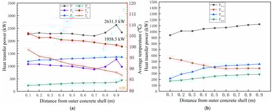 The temperature (T0) of the outer wall of the inner steel shell remains constant at 130 °C. As the distance from the radiation plate to the inner wall of the outer concrete shell increases from 0.1 m to 0.9 m, both the average surface temperature (Tr) of the radiation plate and the average temperature (Tc) of the inner wall of the outer concrete shell exhibit a gradual decline due to the combined effects of heat convection and radiation. According to Formula (2), as this distance increases, the difference in temperatures raised to their fourth power progressively enlarges, resulting in an increase in both radiation heat transfer power (Pr) from the outer wall of the inner steel shell and radiation power (Pbor) from that of the radiation plate. When this distance reaches 0.9 m, there is a maximum increase in radiation heat transfer power (Pr) of 15.1%.