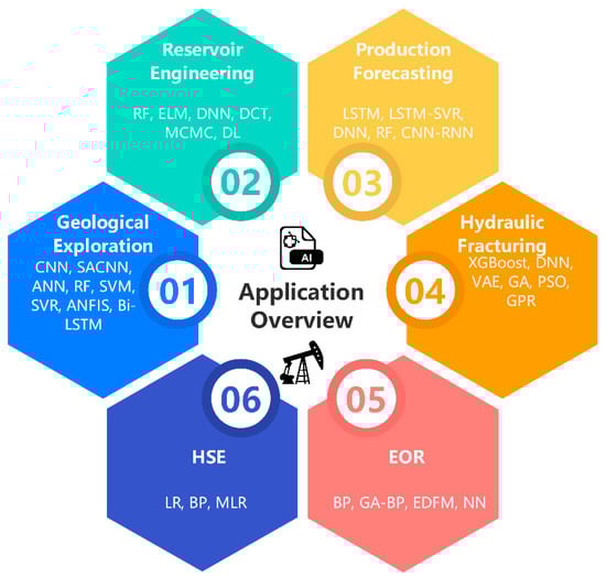 To delve deeper into the applications of AI in unconventional oil and gas exploration and development, this study comprehensively focuses on key issues in the development of unconventional hydrocarbon resources, encompassing geological exploration, reservoir engineering, production forecasting, hydraulic fracturing, enhanced oil recovery (EOR), and health, safety, and environment (HSE) management (as shown in Figure 1). For different application scenarios, we analyzed the specific applications, advantages, and limitations of various AI algorithms, and proposed future research directions and recommendations, aiming to promote the in-depth application of AI technologies in the development of unconventional oil and gas fields. Moreover, AIs have also been increasingly implemented in real-world industrial applications, where major oil and gas companies utilize AI-driven intelligent field management, predictive maintenance, and real-time production optimization to improve efficiency and reduce operational costs.