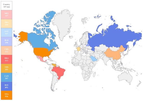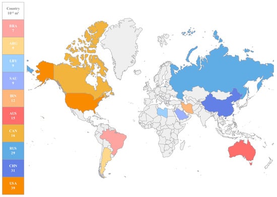 According to assessments, the global recoverable unconventional oil and gas reserves are approximately 44.21 billion tons and 227 trillion cubic meters, respectively, (as shown in Figure 2 and Figure 3). These reserves encompass heavy oil, oil sands, tight oil, oil shale, shale gas, tight gas, and coalbed methane, significantly surpassing the reserves of conventional oil and gas resources [57]. The rise of unconventional oil and gas resources is attributed not only to their substantial reserves but also to breakthroughs in oil and gas development technologies. In particular, innovations in horizontal drilling and hydraulic fracturing technologies have made previously difficult-to-extract resources economically viable [58].