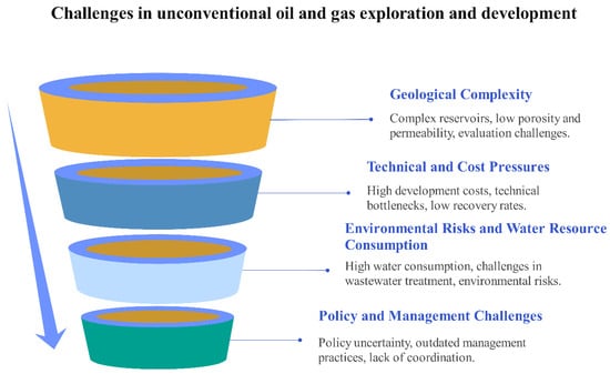 Secondly, there are technological and cost challenges. Traditional drilling and completion technologies are inadequate in meeting the demands of unconventional oil and gas development, necessitating the adoption of advanced techniques such as horizontal drilling and multistage hydraulic fracturing. However, these technologies encounter technical bottlenecks and high development costs. The success rate of drilling operations is relatively low, drilling cycles are prolonged, fracturing effectiveness is limited, and it is difficult to improve oil and gas recovery rates [68,69]. High development costs and insufficient infrastructure constrain the economic viability of unconventional oil and gas, necessitating cost reductions through technological innovation and policy support [70].