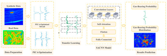 Gas probability prediction plays a critical role in the exploration of unconventional oil and gas reservoirs. Traditional methods often fail to capture the complex nonlinear relationships between seismic data and reservoir characteristics. Yang et al. (2024) have proposed a method based on a Self-Attention Convolutional Neural Network (SACNN), combined with transfer learning and the use of Multi-Component Seismic Attribute Data (MSAD), to achieve a high-precision prediction of Gas Probability Distribution (GPD) in tight sandstone gas reservoirs (as illustrated in Figure 5) [83]. By incorporating self-attention mechanisms, the model enhances its focus on key features, achieving an R2 of 0.9731 and significantly improving predictive accuracy.