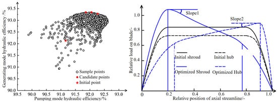 Today’s PT designs integrate multiple disciplines, including hydraulic engineering, mechanical engineering, electrical engineering, fluid dynamics, materials science, etc. Although the motion of an ideal fluid does not vary with time, we assume that fluid in the runner is axisymmetric and the blade is infinitely thin [17,22]. With continuous improvements in theory and design methods for reversible hydraulic machinery, high-head, large-capacity, and high-speed PTs are applied in PSPs to improve economic efficiency [33,34]. Most PTs are designed in pumping mode and calibrated in generating mode for two main reasons: the high-efficiency region in pumping mode is narrow, and the design boundary at the highest head requires a certain head allowance. The lowest head in pumping mode should be limited to the maximum entry force; cavitation is controlled under the premise of meeting the pumping volume requirement. Normally, generating mode is used to verify the runner that designed in pumping mode, although some PTs are designed in turbine mode and calibrated in pump mode [35,36]. In fact, effective energy matching between pumping and generating modes is essential to fully utilize the generator’s capacity [37,38]. The IDM applied to PTs in China was proposed by Qi Xueyi from Lanzhou University of Technology in 1980; later, computational fluid dynamics (CFD) were used by Liu weichao and Yang lin in 2003 and 2005 to design and optimize PTs, respectively [39,40]. IDM designs the runner in generating mode; the velocity is decomposed into circumferentially averaged and periodically pulsating components along the flow direction. The blade shape is determined iteratively to satisfy the flow boundary conditions. The blade’s contribution to the flow field is replaced with a source–sink vortex on the blade’s center plane. Two-way flow characteristics of the pump and turbine are comprehensively taken into account. Consequently, IDM focuses on hydrodynamic parameters rather than structural parameters, making it a more physically intuitive method for reaching the desired flow field [41,42]. IDM is also used in other turbomachinery, applied in combination with genetic algorithms, multi-objective optimization, and other methods, contributing significantly to efficient design work [43,44]. Ref [45] provides further examples of IDM applications in engineering. Figure 3 shows the optimization of hydraulic efficiency and load distribution on the blades of one PT designed by IDM in previous work by the authors. The design process begins with determining key hydraulic design parameters, such as rotating speed, mass flow, water head, efficiency, output and input requirements, etc., which are typically specified in pumping mode. The second step is calculating the main structural parameters of the flow domains, like diameter, height, and the profile of each flow part, based on the optimization of hydrodynamic parameters with IDM in the flow field. The last part is the broadening of high-efficiency zones that take into account the two-way modes, as well as bidirectional feedback on hydraulic design and fluid stability (pressure fluctuations, vortex evolution, flow-induced noise, hydraulic excitation, etc.) [38,46,47].