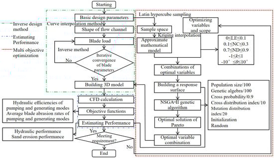 The MOM is an optimization technique for finding the optimal equilibrium among multiple conflicting objectives; its specific research methods mainly consider linear weighting, the principal objective, ideal point, Pareto solution set, genetic algorithm, particle swarm optimization, simulated annealing, gradient descent, etc. [49,50]. The application of the MOM in PT primarily includes the following aspects: determining the objective function, with the aim of increasing hydraulic efficiency and improving operational performance (especially for system stability of S characteristics) [51,52]; calculating hydraulic and structural parameters; and using the orthogonal test method (OTM) to build a parameter library, which further determined the influence weights of each parameter by intuitive, indirect, and extreme variance analyses. This allows for sensitivity analysis of optimization variables, highlighting their impact on PT performance and guiding subsequent design adjustments [53,54]. Selecting an appropriate algorithm is important to design work from the perspectives of accuracy, workload, and time, in addition to having a direct impact on the quality of optimization results [55,56]. Moreover, the MOM can be combined with the IDM to comprehensively consider multi-type performance of PTs in the design work. For instance, previous work by the authors integrated the MOM with the IDM to evaluate both hydraulic and sediment abrasion performance, as shown in Figure 4.