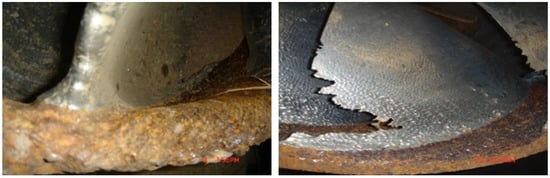The development of the cavitation mechanism is explored from a vacuolar microscopic perspective, and the cavitation influence is analyzed from a macroscopic perspective on flow fields and structural materials based on the theories of pressure waves from vacuole collapse shock and micro-jets [91,92]. Cavitation models (Singhal, Zwart-Gerber-Belamri, Schnerr and Sauer etc.) are widely used to simulate the cavitation process in hydraulic machinery. Techniques such as pulsating laser, high-speed photography, the use of ultrasonic cavitation instruments, etc., are used to observe vacuolar collapse in experiments, aiming to study material damage caused by incipient and developed cavitation and exfoliation [93,94]. The abrasion damage of sediment on metal materials is explored from the perspective of sand characteristics (composition, size, shape, concentration, etc.) and the interaction between sand swarms and the main stream is analyzed from the point of view of force (viscous resistance, additional mass force, acceleration force, pressure gradient force, etc.) based on multiphase flow dynamics [95,96]. Abrasion models (Finnie, Oka, McLaury, etc.) are applied in the simulation of fluid–solid erosion, with techniques like PIV, loss-in-weight, and micro-morphological analysis methods commonly employed in abrasion tests [97,98]. In addition to two-phase flow (air–fluid and solid–fluid flow) studies, several representative research directions are highlighted below. (1) Multiphase flow models, such as fluid volume, mixture, Eulerian, discrete-phase, population balance, and Lagrangian dispersed-phase models, are common multiphase models used in the flow field of hydraulic machinery, each with its own characteristics and applications [99,100]. The integrated application of artificial intelligence, big data, and other advanced technologies in the data processing and analysis of multiphase flow models can improve their accuracy and reliability, further expanding the scope of their utility [101,102]. (2) Interactions between different media, including typical non-linear features, such as convective migration, structural plastic damage, and destruction, are inevitable in the multiphase flow field of hydraulic machinery. These non-linear characteristics make it difficult to predict the behaviors of bubble and sand groups. Sand particle clusters affect the generation, development, and shedding process of cavitation and even the location, shape, and depth of cavitation. Meanwhile, effects such as air cushioning and wrapping of the bubble cluster can affect the trajectory and traveling speed of the sand particles [103,104]. This combined effect of abrasion and cavitation promotes mutual wear, significantly reducing the hydraulic performance of PTs and further threatening system safety and stability. (3) Space-time evolution, including material damage from bubble collapse, impacts, and sediment abrasion, increases with time. Currently, there is no systematic theory to explain the change rule of the material caused by cavitation and abrasion of hydraulic machinery over time. Exciting frequencies of cavitation and abrasion vary with spatial location. As different flow domains are manufactured with different materials (concrete and various metals), seeking wear-resistant coatings or materials is necessary in engineering. Consequently, it is necessary to reveal local and multi-scale properties, as well as transient and cyclic characteristics, in future cavitation and erosion research on space-time evolution. (4) Predictive models of cavitation and sediment erosion, including the discrete bubble method, the intensity function method, the erosion aggressiveness index, etc., are used to predict cavitation intensity, etc. [105,106]. The abrasion prediction model proposed by Durinev and Pelaev aims to predict the erosive wear of materials by solid particles under specific conditions; this method is widely used in the relative studies [95,97]. Recently, Yogesh proposed a novel mechanistic mathematical model for the prediction of solid-particle erosive wear, assuming angular particles of square pyramidal shapes [107]. The development of accurate predictive models for material damage due to cavitation and sediment erosion is crucial for the prevention of field failures and accidents. For example, Figure 5 shows abrasion damage of runner blades, which was discussed by the authors in the previous stage [108].