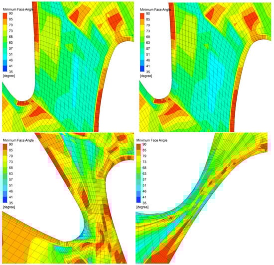 Dynamic mesh technology is mainly used to implement component motion in simulation calculations, and improved DMT can deal with boundary motion or deformation problems in fluid simulation; for example, the mesh sliding technique can be applied as mentioned in ref. [81]. Addressing the mesh dynamics of complex structures is a difficult problem, the process of which involves automatic mesh reconstruction, adaptive adjustment, real-time updating, etc. [122,123]. For example, smoothing, layering, and remeshing are three main methods used in Fluent 2023 R1 to predictively update the kinematic mesh. Additionally, these methods automatically check the quality of the updated mesh to avoid negative mesh volume. User-defined functions (UDFs) in Fluent, commands in CFX, and OpenFoam enable secondary development through code procedures to control mesh node movement. Programmatic customization of structural motion is a prevalent approach to ensure mesh quality [124,125,126]. The orthogonality, aspect ratio, skewness, Jacobi ratio, warping factor, minimum face angle, etc., are measures of mesh quality, among which orthogonality and the minimum face angle are more commonly used parameters in hydromachinery research. Figure 6 is a PT case with dynamic mesh during the load rejection period.