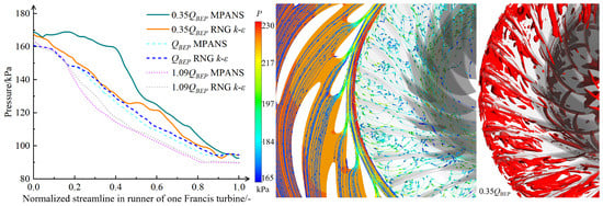 Efficiency, overflow capacity, head, power/output, vibration, noise, etc., are the main indicators of hydraulic performance, wherein profiles and flow angles of blades, multi-stage runners, variable-speed operation, etc., are studied to ameliorate the hydraulic performance of PTs [4,16]. Some of the main directions of hydraulic performance are listed as follows. (1) In general, volumetric and mechanical losses of PTs are constant values, whereas hydraulic loss depends on operational conditions (along-track loss, localized loss, impingement loss, vortex loss, etc.). Optimization of flow passages, the use of drag-reducing materials, adjustment of operating parameters, regular maintenance, etc., are the main paths to reducing losses at present. In recent years, the entropy production loss method has been combined with differential kinetic energy balance equation to solve the hydraulic loss from the thermodynamic point of view [79,80], which provides a new research insight for hydraulic machinery. (2) Rotor–stator interaction is caused by guide vanes and runner blades under steady conditions, while rotor–rotor interaction appears at transitions of PTs. If the dynamic and static interference frequencies are the same or close to the self-oscillation frequencies of structures, system resonance occurs, potentially seriously endangering the operational stability of PTs. Consequently, a large amount of studies have been carried out to explain the interference principle [81,82,83], but no systematic theory has been developed to comprehensively explain and respond to interventions among guide vanes and runner blades. (3) Flow-induced oscillation is inevitable in the operation of PTs, and long-term fatigue vibration can easily lead to structural damage. Current public research is committed to revealing the vibration generation mechanism and exploring effective vibration reduction measures, in which the fluid–solid coupling method is integrated with fluid mechanics, solid mechanics, computational mechanics, and other fields to analyze the interaction mechanism between fluid and solid structures. Collecting experimental data such as structural deflections, bearing and shaft vibrations, etc., and comparison with numerical modeling results to study the external characteristics of flow-excited vibrations presently represent the main approaches [84,85,86]. (4) Dynamic turbulence, vortex evolution, pressure fluctuations, etc., are the sources of flow-induced noise. The flow velocity, flow-channel structure, flow characteristics, etc., have direct impacts on the noise level. Because noise-affecting factors are difficult to qualitatively consider in PSPs, an assumption of boundary closure is necessary in research on flow-induced noise, wherein acoustic coupling methods can be used to solve the dynamic behavior of the acoustic wave and structural vibration under different conditions [87,88]. Furthermore, it has been found that optimizing the structural design, using noise-reducing materials, and improving the working conditions to adjust the flow rate and pressure can effectively reduce the noise level [89,90].