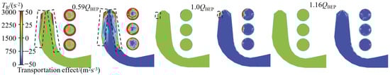 Comparison of distributions between transportation effect and Liutex transport intensity () in the draft tube [140].