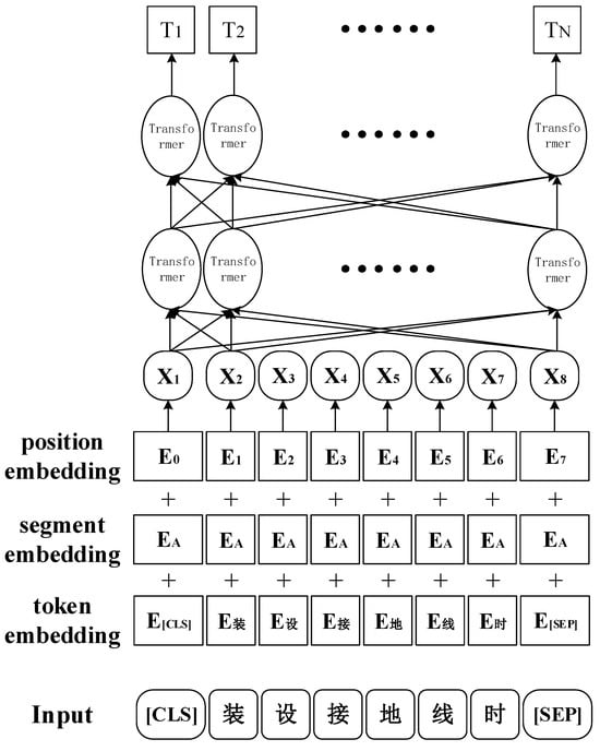 The input vectors for BERT consist of three main components: token embeddings, segment embeddings, and position embeddings. The ‘[CLS]’ token is a special marker used for classification, typically placed at the beginning of the sequence, while the ‘[SEP]’ token is used to separate sentences, usually placed at the end of the sentence. An example of the input (“装设接地线时”) is shown in Figure 2.