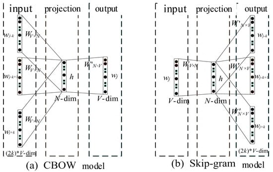 Word2vec [27] is a word embedding model proposed by Google in 2013. The Word2Vec model includes two methods for training word embeddings: the Continuous Bag of Words (CBOW) model and the Skip-Gram model. In the CBOW model, the goal is to predict the center word based on several surrounding words. In contrast, the Skip-Gram model works in the opposite direction; it uses the center word as the starting point to predict and generate the surrounding context words. The structure of the Word2Vec model is shown in Figure 3, which includes the input layer, projection layer, and output layer.