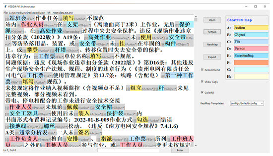 Data from 24,001 work records collected by a power grid company from January to July 2022 were obtained. After text preprocessing, 15,183 usable violation records were retained, including complete violation descriptions for field operations. Based on expert knowledge, five types of labels were determined: Action, Object, File, Person, and Surrounding. The YEDDA annotation tool was used to perform BIO labeling on the collected power grid field operation violation descriptions. The final BIO dataset for named entity recognition of the violation descriptions was annotated by two staff members, and any discrepancies in the annotations were discussed and re-labeled. In the BIO scheme, ‘B’ indicates the beginning of an entity (Begin), ‘I’ indicates inside an entity (Inside), and ‘O’ represents positions outside the entity (Outside). The specific YEDDA annotation process is shown in Figure 6.