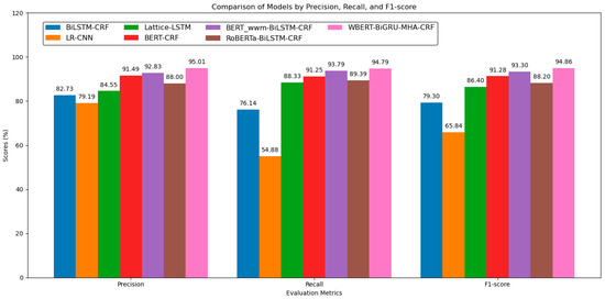 To validate the effectiveness of the model proposed in this paper, we compare it with several commonly used entity recognition models: BiLSTM-CRF [16], LR-CNN [31], Lattice-LSTM [22], RoBERTa-BiLSTM-CRF [32], BERT-CRF [19], and BERT_wwm-BiLSTM-CRF [33], with BiLSTM-CRF as the baseline model. After several experiments, we determined that , which may be related to the fact that most of the violation descriptions in the power grid field operation data contain fewer than 32 characters. In the comparison experiments, in order to be fair, the model constructed in this paper and other comparison models use Adam as the optimizer, the learning rate is set to , the number of training rounds is set to , and the specific comparison results are shown in Figure 7. The specific numerical results can be found in Table 3.