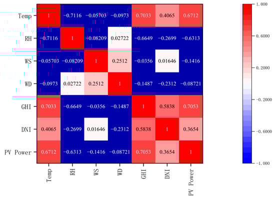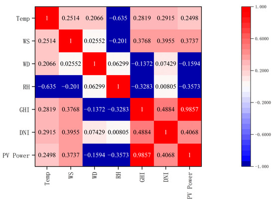 The output of PV systems is affected by various meteorological factors, including wind direction, air temperature, relative humidity, and total horizontal radiation. The effect of different meteorological factors on PV power varies. In order to determine the meteorological factors affecting PV power, this study utilizes the Spearman correlation coefficient (SCC) [17]. The SCC is a statistical measure of the degree of correlation between eigenvectors and target vectors. It determines the correlation between two vectors by comparing their rankings instead of their original values. In contrast to the Pearson correlation coefficient (PCC) [18], the SCC does not necessitate the implementation of a normality test when evaluating the correlation between a feature vector and a target vector. Consequently, it exhibits a more expansive range of applicability and a superior capacity to accurately reflect the degree of correlation between the two. In contrast to the PCC, the SCC is calculated based on the “rank” of the data rather than the actual value of the data, and its precise expression formula is as follows: