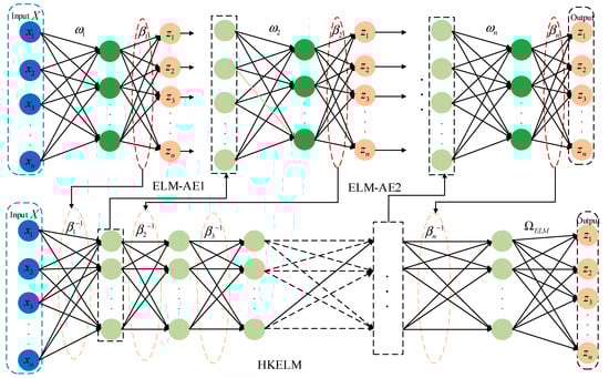 The AutoEncoder (AE) concept is incorporated into the ELM framework to maximize the potential of deep learning for feature extraction and the generalization of kernel functions. The network is capable of achieving the effective alignment of inputs and kernel outputs through training, enabling kernel function-based data reconstruction. A deep hybrid kernel extreme learning machine (DHKELM) is a deep learning method created by stacking multiple ELM-AEs. This structure enhances the network’s representational capacity by using multiple ELM-AEs to build a deep learning architecture that incorporates hybrid kernel functions, replacing the traditional stochastic mapping approach [22]. By employing a hierarchical unsupervised training method, DHKELM is capable of reducing reconstruction errors in a more effective manner and achieving a more precise alignment between input data and kernel output data. In comparison to traditional deep learning algorithms, this approach demonstrates a robust capacity for generalization while facilitating feature extraction. The model’s architecture is illustrated in Figure 3.