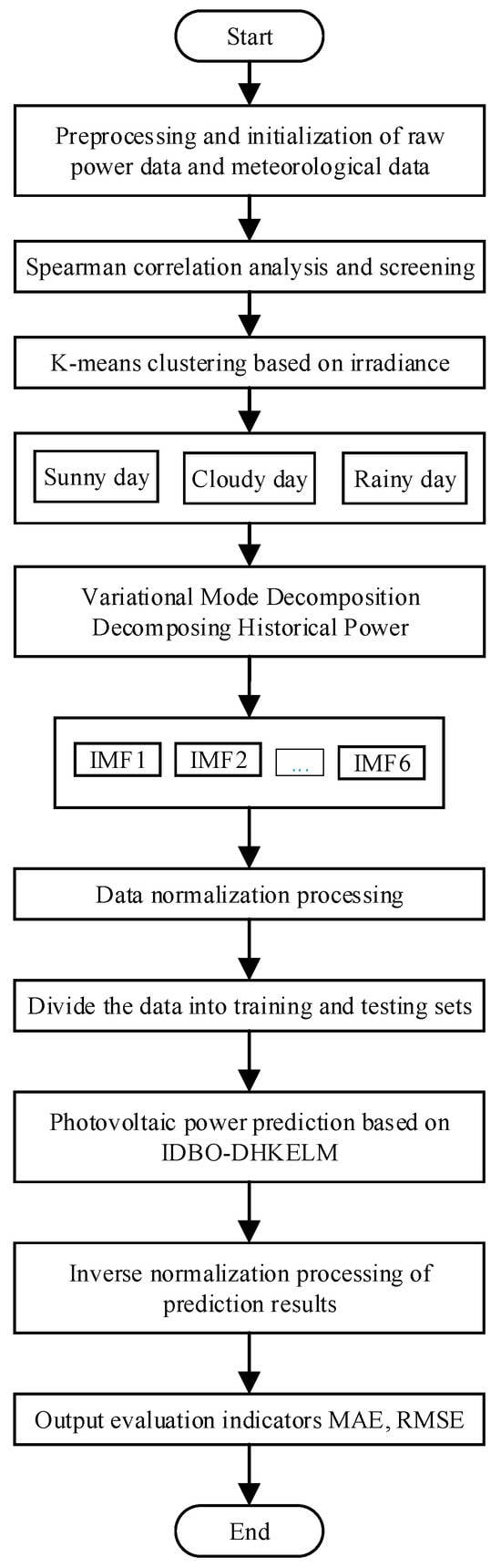 Based on the previous analysis, this paper introduces a short-term PV power prediction approach that combines the advantages of several models. First, the data are preprocessed by removing PV power during invalid time periods and excluding meteorological factors with a minimal impact on PV power, using Spearman’s correlation coefficient. Subsequently, the K-means algorithm is used to group days with similar patterns, after which the original PV power data are decomposed using variational mode decomposition (VMD). The non-recursive nature of this approach facilitates the effective extraction of input coefficient information, thereby improving data quality. Finally, the hyperparameters of the deep hybrid kernel extreme learning machine (DHKELM) model are optimized using the improved dung beetle optimizer (IDBO), enhancing the accuracy of PV power predictions.