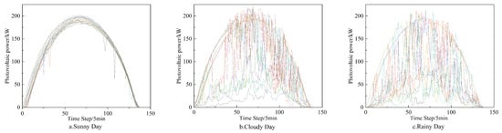As illustrated in the figure, the suggested power prediction model aligns well with the actual PV power output during sunny days, where there is less fluctuation in PV power. This suggests that the model is effective in capturing PV power trends under stable weather conditions. Even in more dynamic weather scenarios, such as cloudy or rainy days with significant PV power fluctuations, the model maintains high prediction accuracy, effectively tracking instantaneous power variations. Furthermore, as illustrated in Figure 10, the combined prediction model continues to deliver strong results using low-frequency historical power data, highlighting its robust generalization ability and minimal reliance on extensive data. The results in Table 3 further indicate that the proposed algorithm effectively models the output power curve, achieving high accuracy across a range of weather conditions, whether involving minimal fluctuations in PV or more complex weather patterns. This demonstrates its robust predictive capability under diverse environmental scenarios.