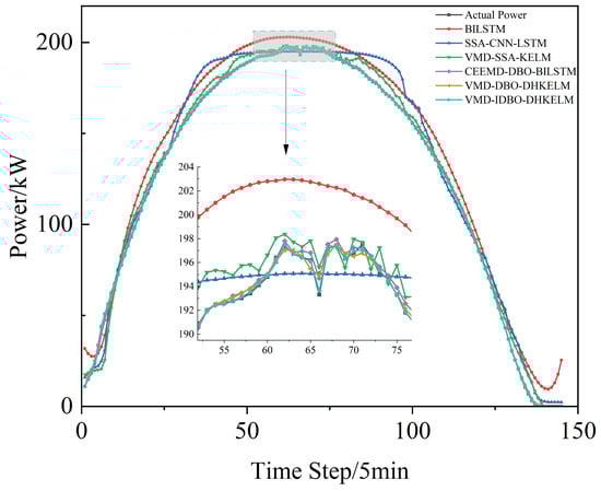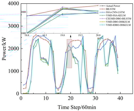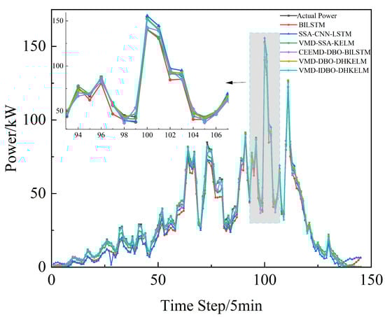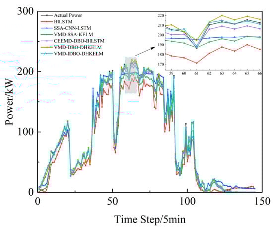In order to ascertain the efficacy of the enhanced dung beetle algorithm in optimizing the DHKELM prediction model, a comparative analysis was conducted using four distinct methodologies: BILSTM, SSA-CNN-LSTM, VMD-SSA-KELM, CEEMD-DBO-BILSTM, and VMD-DBO-DHKELM. The results of the individual models’ predictions for Alice Spring, under sunny, cloudy, and rainy weather conditions, are presented in Figure 7, Figure 8 and Figure 9, respectively. Figure 10 depicts the results for Kashgar. Table 3 lists the evaluation indexes.