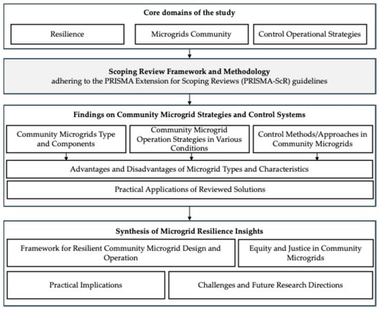 This review employs a scoping methodology to systematically explore the operational strategies and resilience measures of community microgrids. By synthesizing the existing literature, this review aims to identify key trends, challenges, and gaps in current research. The methodology was designed to ensure a transparent and rigorous process, adhering to the PRISMA Extension for Scoping Reviews (PRISMA-ScR) guidelines []. While the protocol was not formally registered, a detailed framework guided the review process, including eligibility criteria, search strategy, and data extraction.