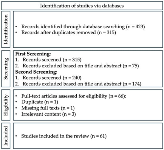 This criterion emphasized the resilience aspects of community microgrids, further refining the selection to 66 articles. Five articles were excluded due to content overlap or insufficient methodological detail, resulting in 61 articles for in-depth analysis.