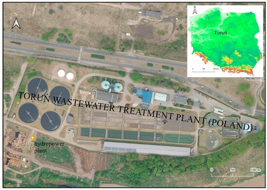 Since 2016, a hydropower plant has been operating at the outlet of the treatment plant, where the treated wastewater is directed to the Vistula River. It uses the natural accumulation of water in the treated wastewater chamber, which is located below the secondary settling tanks. The hydropower plant is equipped with a 55 kW Francis turbine. The energy produced is used to compensate for the electricity needed for wastewater treatment. Its location is shown in Figure 1. The exact operating principle of the power plant and construction diagrams are included in the previously published article [26].