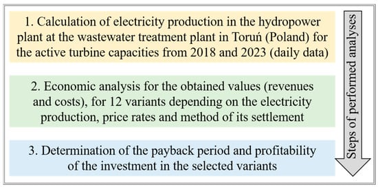 As can be seen, the above considerations mainly concern run-of-river, reservoir, and pumped-storage hydropower plants. However, there are few publications so far related to the economic analysis of hydropower plants in WWTPs (examples: Tatkar WWTP in Ankara, Turkey [36], WWTPs in Great Britain and Ireland [37], comprehensive analysis of 46 facilities in 14 countries [38]). In the case of Poland, Central Europe, i.e., the country on which this publication focuses, no results in this area have been published so far, so it was decided to fill this knowledge gap. Currently (December 2024), there are three hydropower plants in WWTPs, i.e., in Szczecin, Kraków, and Toruń, using Francis or Kaplan turbines with capacities of 140, 130, and 55 kW, respectively [26,39,40]. The distinguishing element of this article from similar economic analyses of WWTPs is the use of variants based on different criteria, i.e., electricity settlement principles (households, competitive market), energy sales prices (2018, 2023), the amount of electricity produced (2018, 2023), and using actual and potential electricity production data. In addition, the actual results of the active power of the turbine, i.e., delivered to the power grid, are used, which increases the quality of the presented analyses. In other studies, estimated values of head, efficiency, and flows were usually used, and only on this basis were the power and electricity production determined, e.g., [36,38,41]. The methods used in similar analyses include sustainable management models (a combination of economic, environmental, and social analyses) [42], determination of energy recovery potential, economic profitability and sensitivity analysis [36], fuzzy logic tool (technical, economic, and environmental aspects) [35], algorithm using GIS data, inflows, local investment costs, and electricity sales tariffs [18].